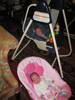 I spend most of my time feeding David and Margot (and changing diapers)....but there is a little bit of time left over for play. David LOVES the swing Marci gave him, and Margot loves her bouncy seat.